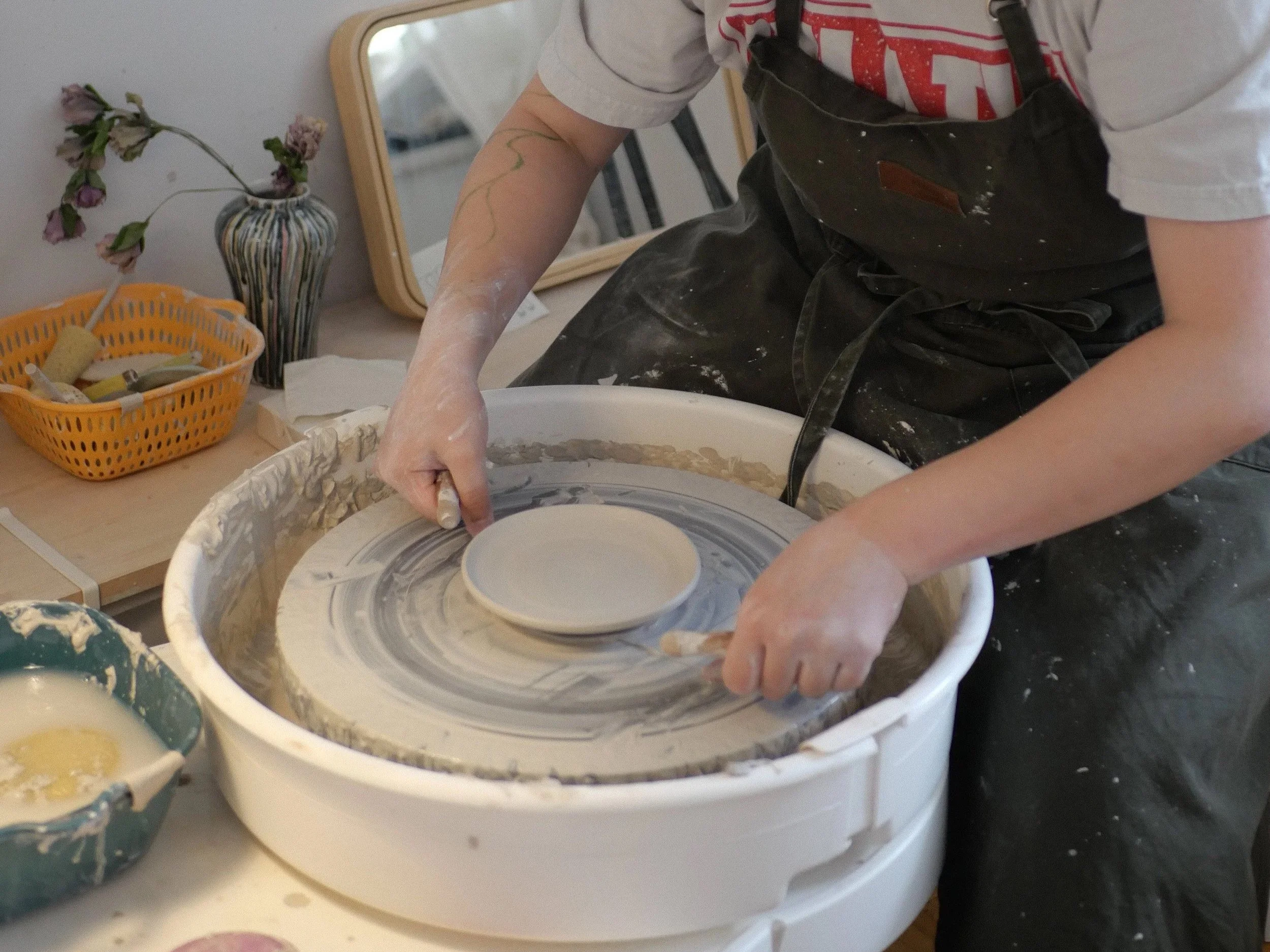 You’ll learn the full process of pottery making—not only forming pieces on the wheel, but also trimming, glazing them.